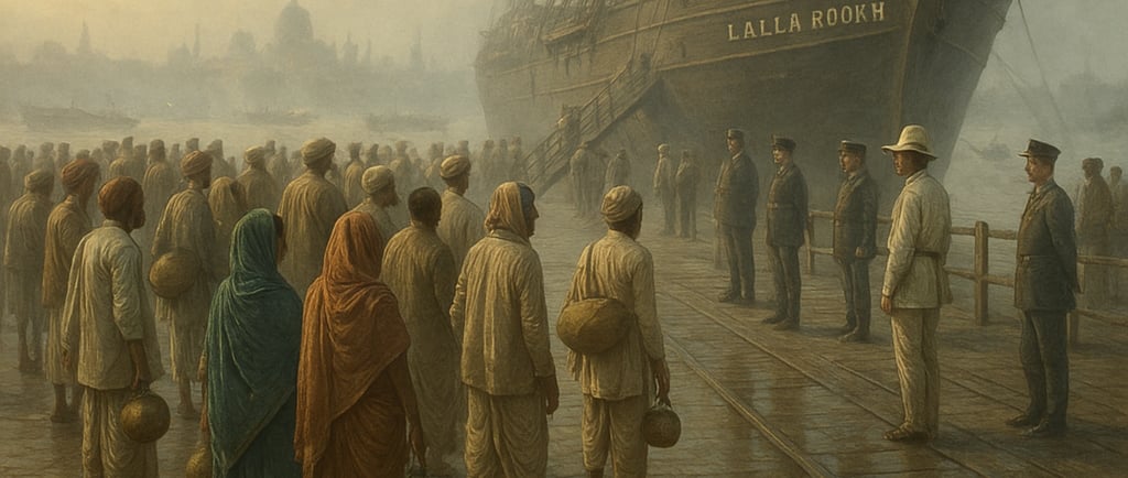 Op 26 februari 1873 vertrok het eerste schip, de Lalla Rookh, vanuit Calcutta. Na 99 dagen bereikte het op 5 juni 1873 Paramaribo, een datum die later symbool zou worden voor een nieuw begin. De reis was zwaar. Stormen, ziekte en sterfgevallen kwamen vaak voor, maar ook geboortes, gebeden en zang vulden de nachten op zee. Tussen hemel en oceaan leerden mensen uit tientallen dorpen samen te overleven.